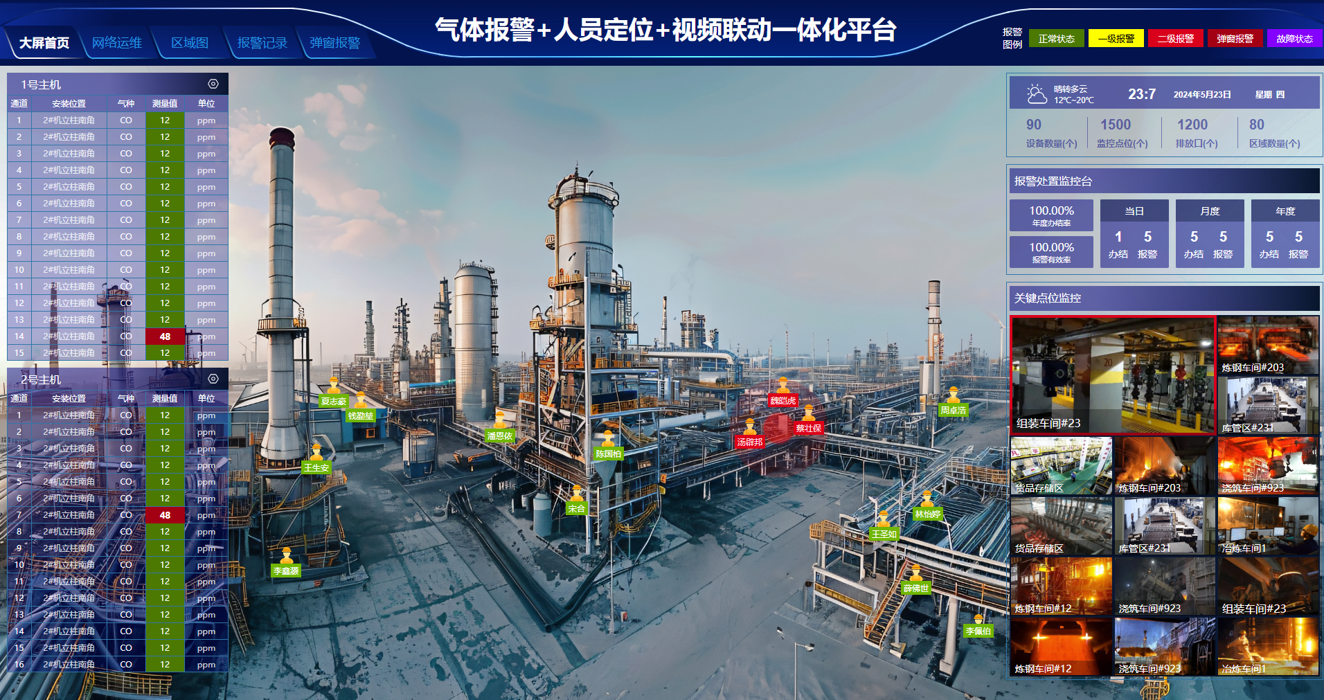 基于GIS地图技术,实时显示全厂设备报警状态(正常、故障、一级/二级报警、离线等)。支持查看实时在线率、预警事件汇总及24小时报警趋势图。