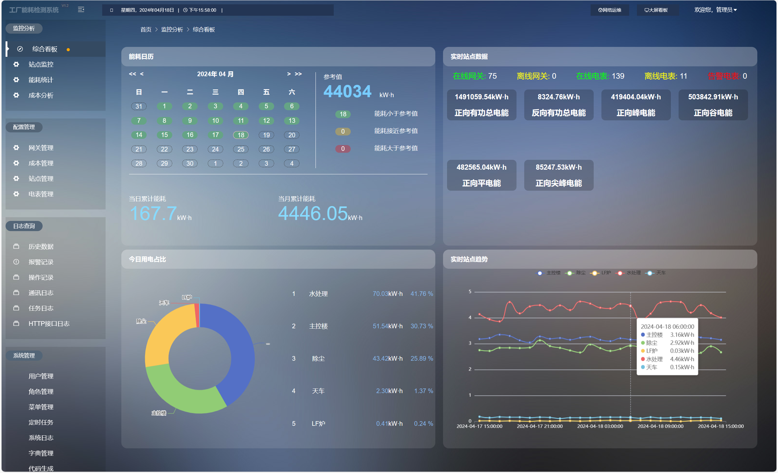 提供能耗日历、今日用电占比饼图及实时站点趋势。直观展示全厂及各部门的用电排名,帮助管理者全局掌控能源消耗状态。