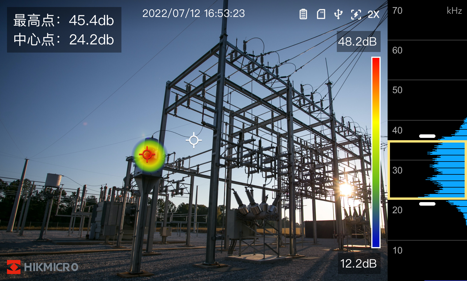 频宽。系统通过波束形成技术获取声源分布,并与可见光视频完美叠加(生成伪彩声学云图),最高/中心声强点自动追踪,让隐蔽的泄漏“无所遁形”。